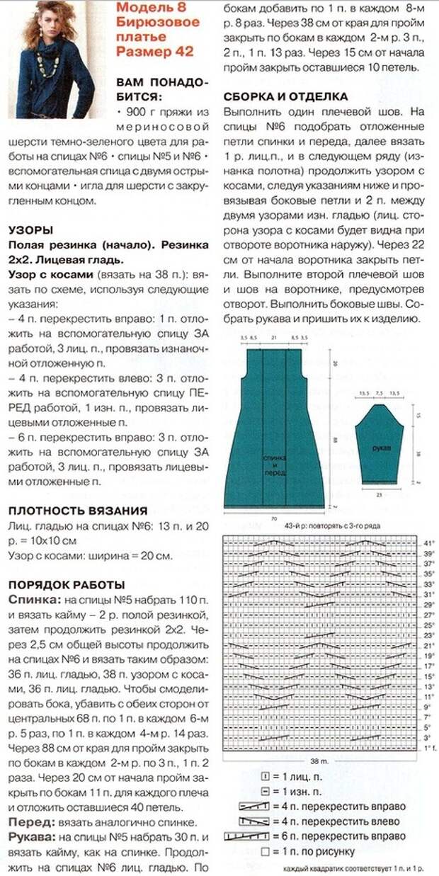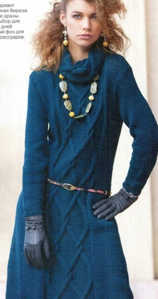 Модель платья взята из журнала "Bellissima" №2/2012 г. Бирюзовое платье связано спицами №5 и №6 из 900 г пряжи из мериносовой шерсти. Размер 42. Схема вязания платья спицами