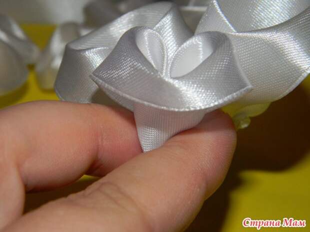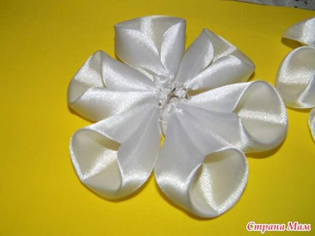 Формируем ряд, при этом расправляя лепестки. Через первый лепесток закрепляем, обрезаем и опаливаем нить