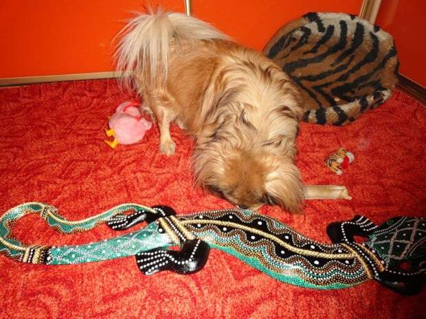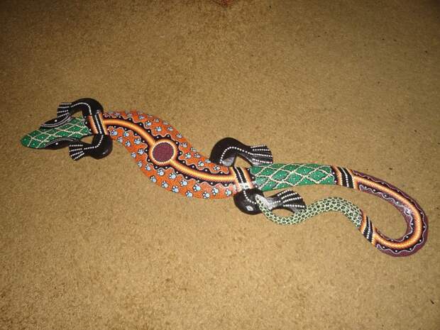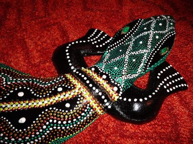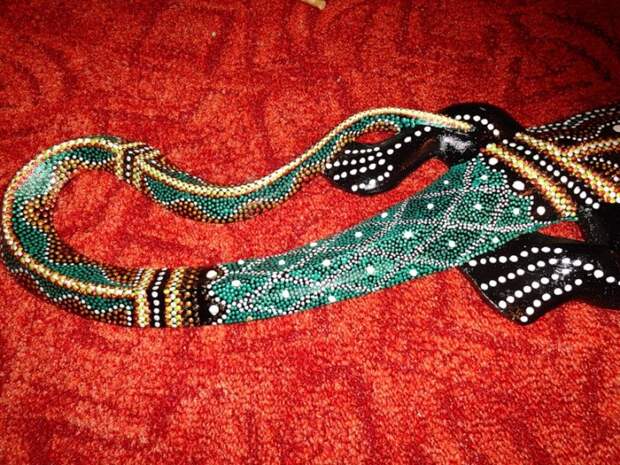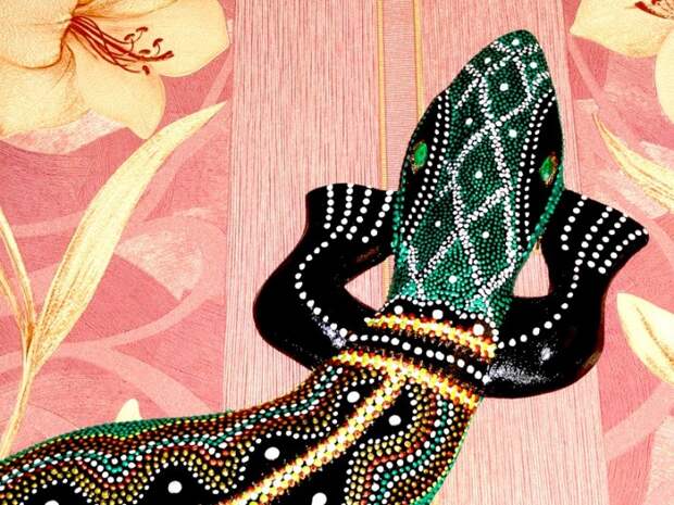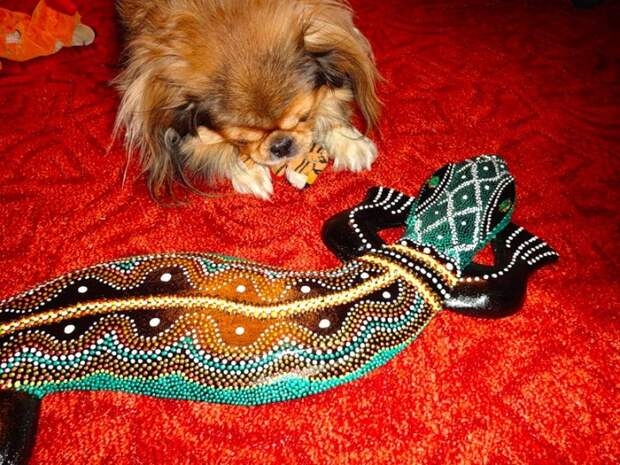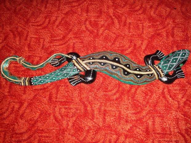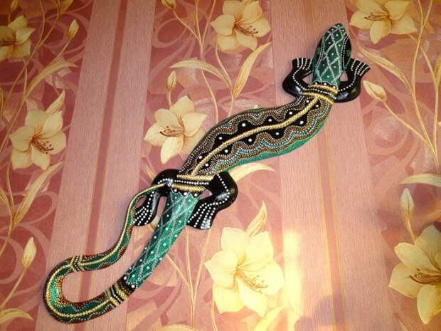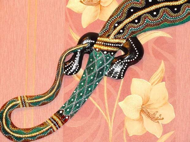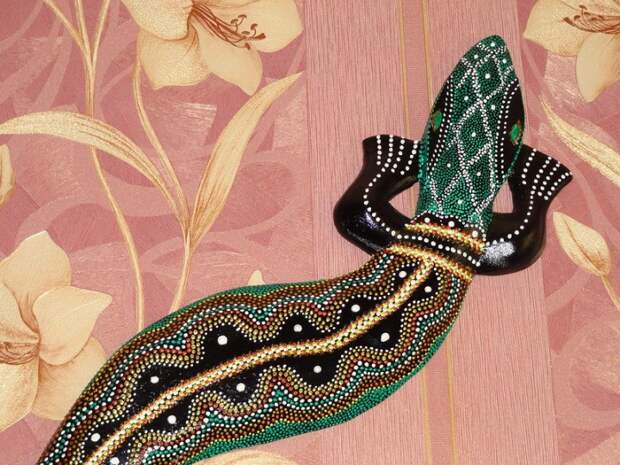 Потом подождала, пока все высохнет.... Зашкурила... Покрасила черной краской, точнее - корабельным черным лаком. И стала раскрашивать контурами, точечной техникой. К сожалению, данный этап пропустила...увлеклась... Опомнилась, когда ящерица была уже наполовину расписана. Сфотографировала её рядом с образцом :