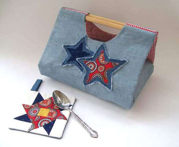 3) Добавляем к внешней детали сумки кармашек для ложки и аппликацию из отделочной ткани. Отдельно я про аппликацию рассказывать не буду, только обращу ваше внимание на то, что аппликация «лохматая», звезды притачаны зигзагом не по самому краю, а края разлохмачены. Но это специфика джинсовки, если вы будете шить сумку в другом стиле, аппликация может быть совсем другой, или ее не быть совсем.