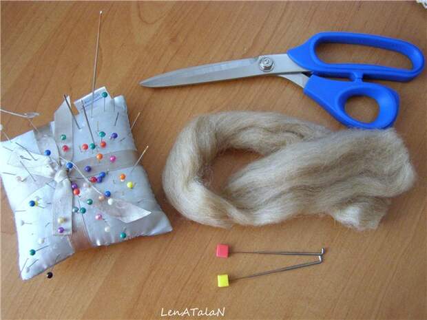 Для этого берем иглы для валяния, шерсть, ножницы. Либо обычные нитки подходящего цвета и иглы. Я делаю волосики из шерсти для валяния.