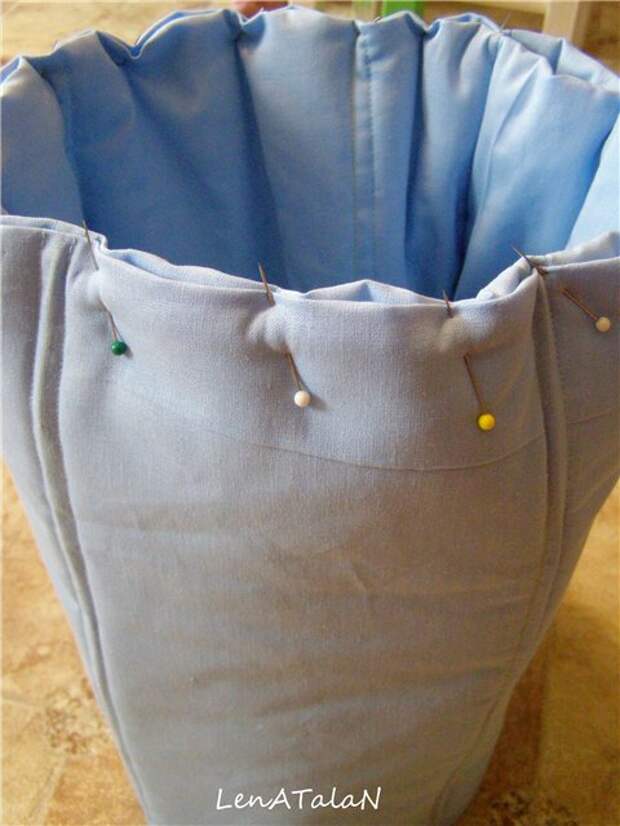 После того, как вся проволока будет вставлена, мы подгибаем верх нашей юбки и скалываем английскими булавками.
