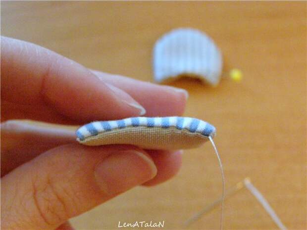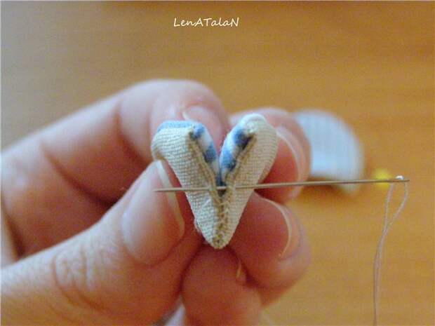 ...затем сгибаем ушко пополам и выводим иголку в центр. Зашиваем до середины и не отрываем нитку, она пригодится нам для пришивания ушка к голове, чтобы не делать лишних узлов.