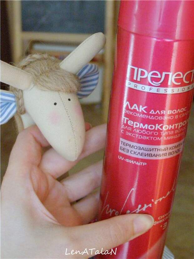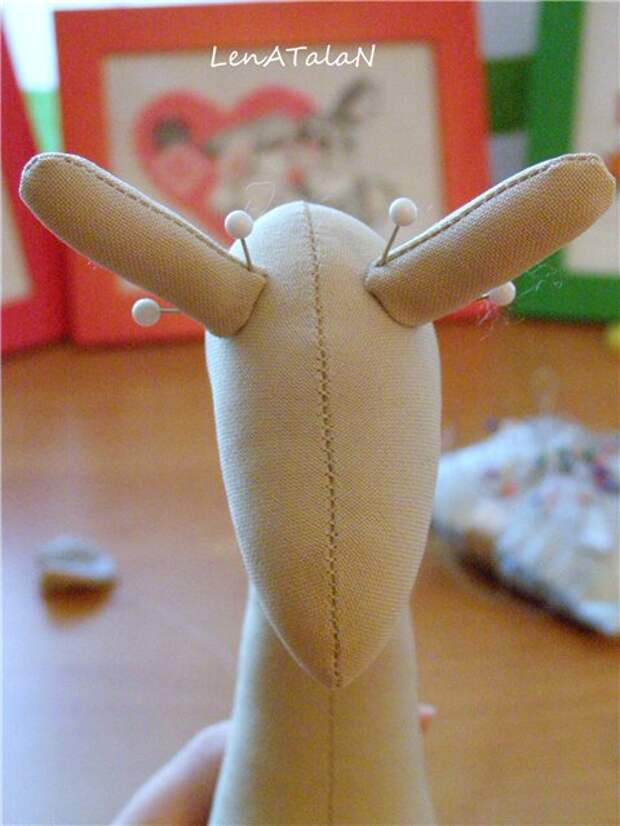 Теперь прикладываем рожки к голове (наклон может быть разным, как Вам больше нравится), закрепляем английскими булавками.