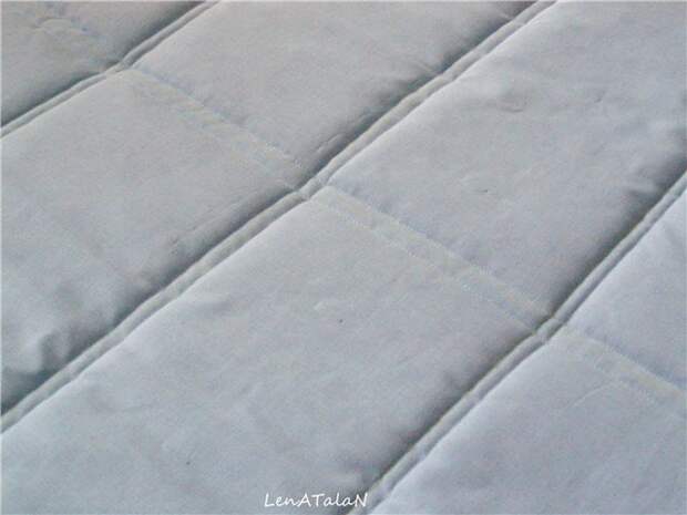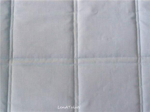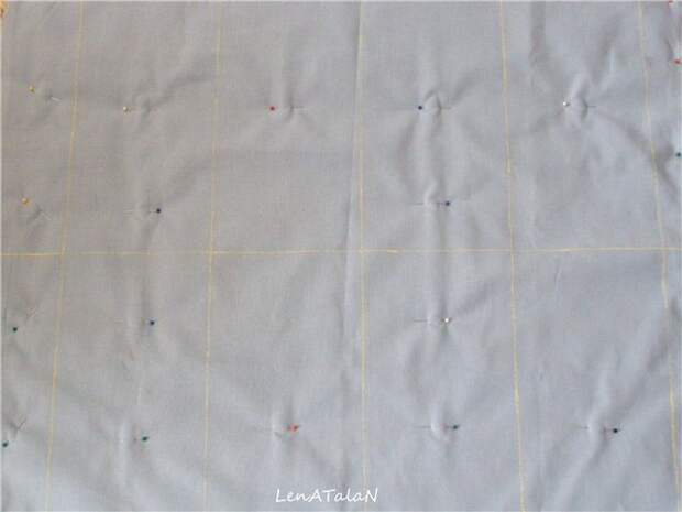 Накладываем ресчерченный прямоугольник на синтепон, скалываем английскими булавками, чтобы при простегивании ткань не сползала с синтепона.