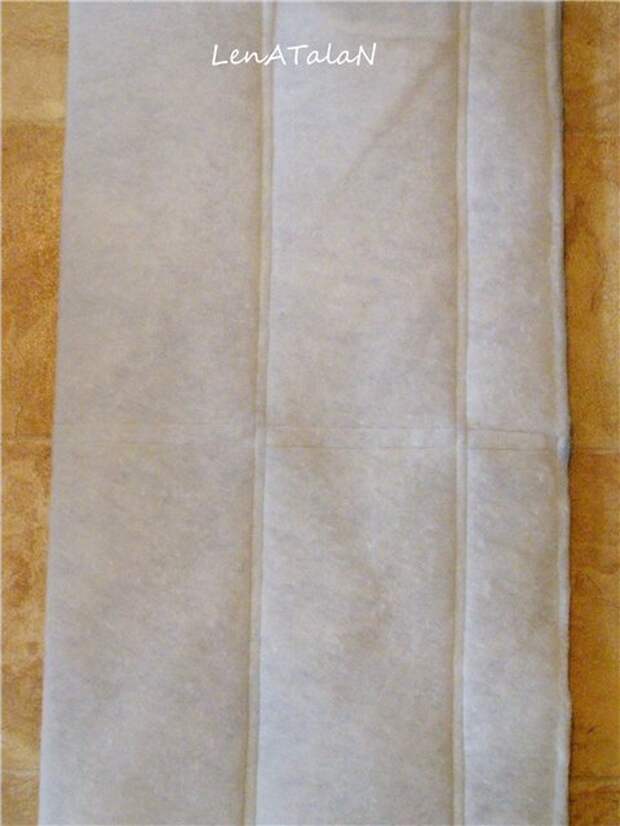 Начнем мы с Вами с внутренней юбки. Выкраиваем из хлопка (у Вас это может быть и др. ткань) прямоугольник 74х80 см., а из синтепона 70х80 см. Сначала делим наш прямоугольник пополам по горизонтали и по вертикали, а затем от середины откладываем по 15,5 см. Как видно на фото, 8 прямоугольников получаются по 15,5 см. шириной, а крайние уже.