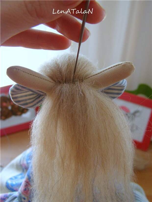 Шерсть очень благодарный материал, причесок можно сделать МНОЖЕСТВОоооо!!! Главное сначала привалять волосики по пробору, а там уже, как говорится, пошла пляска, держите меня семеро!...