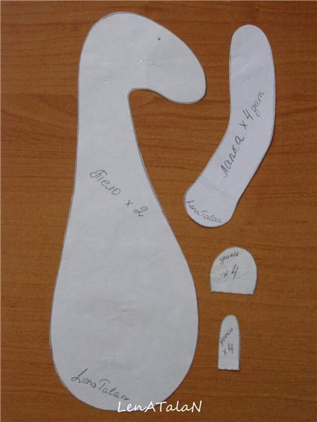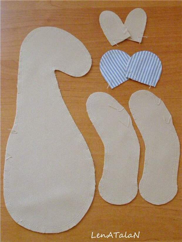 Раскладываем на ткань, обводим. Не забудьте, что внутренняя сторона ушек шьется из хлопка, поэтому телесного цвета будет 2, а не 4 детальки.