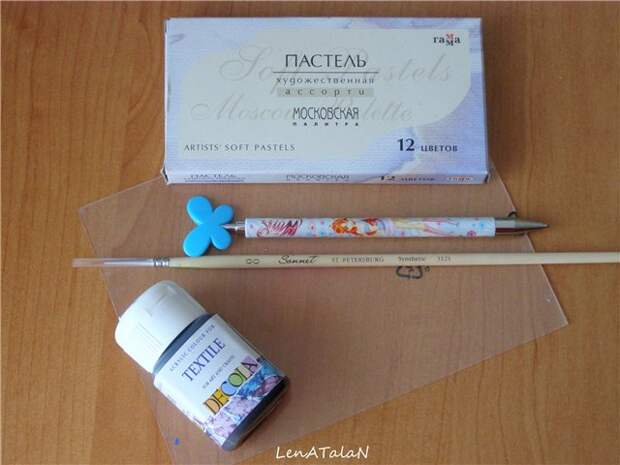 Теперь берем акриловые краски (или нитки) черного цвета, кисть (№0 синтетика), карандаш, пастель или тени (натираем ножом) и ватные палочки.