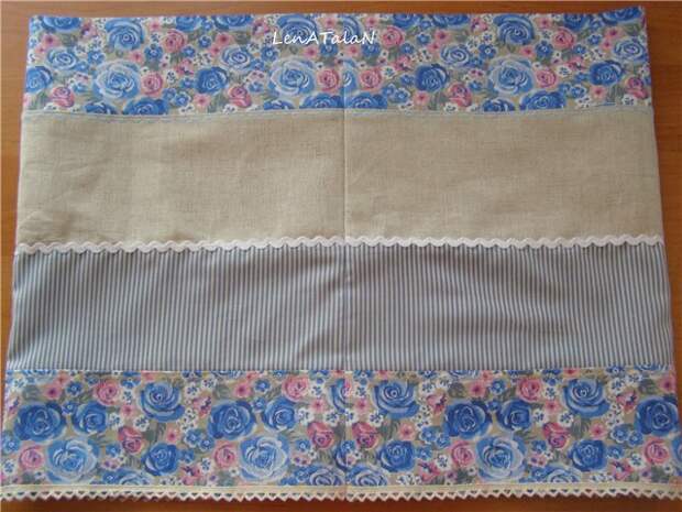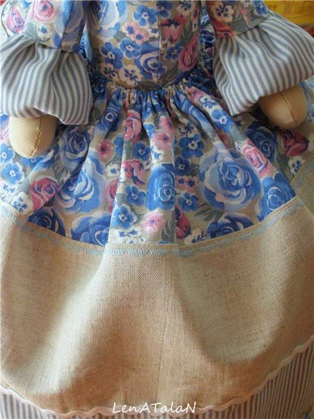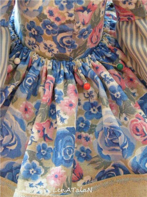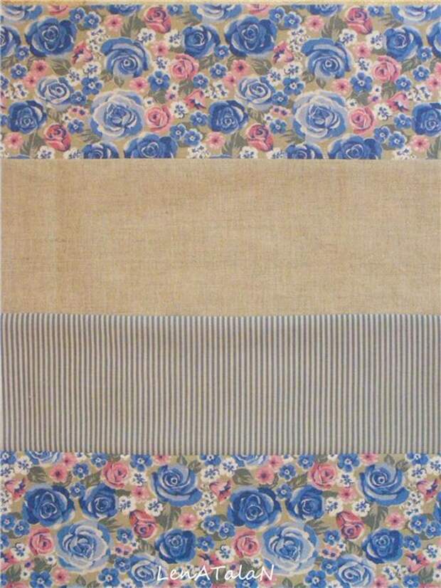 Теперь беремся за верхнюю юбочку. Нам необходимо полотно размером 35х100 см., но так как одного цвета юбочка будет скучновата, я разделила ее на четыре секции: 10 см.х100см.; 12 см.х100 см.; 11 см.х100 см.; 12 см.х100см. (это уже с припусками). Вы же можете сделать, как Вам захочется. Сшиваем наши части, обрабатываем срез и утюжим.