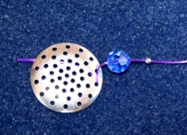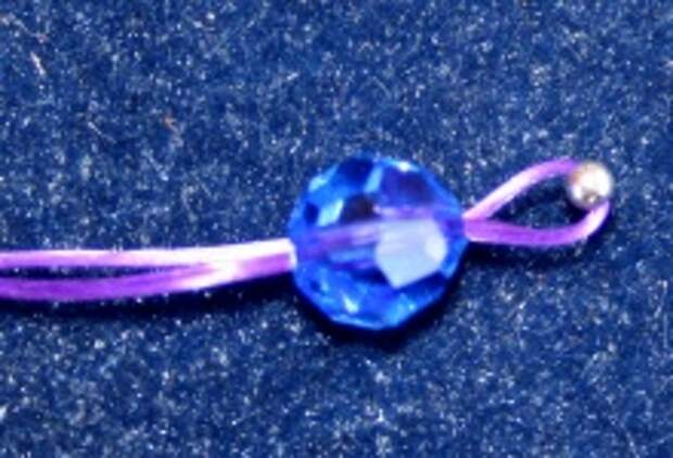 Cogemos un trozo de unos 15 cm de hilo de Nylon transparente que pueda pasar al menos dos veces por las cuentas. Para que se vea bien en las fotos nosotros hemos usado un hilo morado para poner la primera cuenta. - Pasamos el hilo hacia arriba de la regadera y enfilamos una bola de Swarovski de 8 mm y una chafa de plata de ley o plateada.